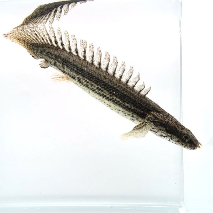 Un pez con características primitivas ("pulmonado") que le posibilitan a respirar aire atmosférico y aguantar fuera del agua bastante tiempo. Un animal impresionante en talla superior a los 12cm (posiblemente más cerca de los 25cm, consultar).